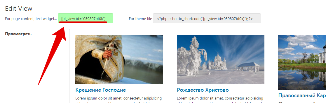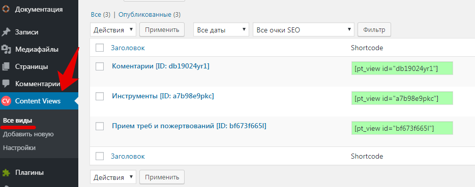 В разделе «Все виды» выводятся все созданные на вашем сайте ленты, с шорткодами: