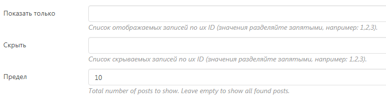 Показывать только — если вы хотите вывести какие-то конкретные записи или страницы, то в этом поле нужно указать их ID. ID записи/страницы можно найти в адресной строке браузера в режиме редактирования записи/страницы. К примеру, в адресе //support.prihod.ru/wp-admin/post.php?post=13131&action=edit циферки после post= это и есть ID записи.